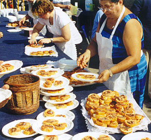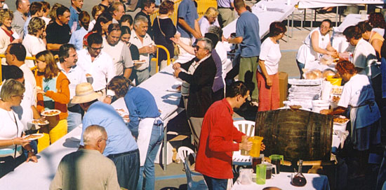 Iedereen moet in de rij. Achter de tafels wordt er druk belegd en getapt om in korte tijd iedereen aan een broodje met Anxoves de L'Escala met een glaasje wijn te helpen.