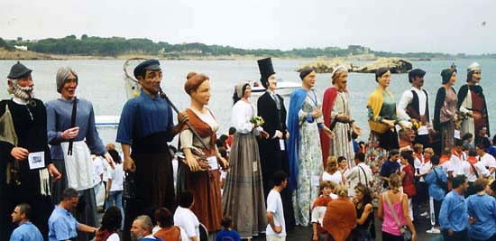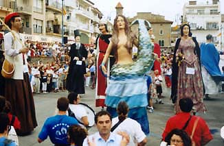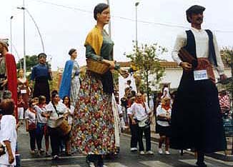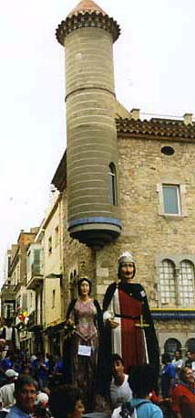 Maximeta, vernoemd naar Santa Maxima, de patrones van L'Escala, met elk in de hand een voor L'Escala symbolisch attribuut, respectievelijk een visnet en een weefschuit.