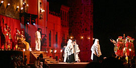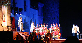 La Passió. Een aantal episodes uit het lijdensverhaal worden ten tonele gevoerd op een groot podium midden op het langgerekte dorpsplein voor het gemeentehuis. De restanten van een middeleeuws kasteel - een gevel en twee torens - vormen het enorme decor en aan weerskanten van het podium bevinden zich de tribunes. Het schouwspel begint met de Intocht in Jeruzalem als een grote menigte - de inwoners van Jeruzalem - vanuit de zijkant, dwars door het publiek, opkomen. Het deel van het passieverhaal dat zich afspeelt op het Plaça Major eindigt met de scène over de veroordeling van Jezus door Pontius Pilatus tot de dood. Hiermee begint de kruisweg, het tweede deel van het passieverhaal, dat zich zal voltrekken op diverse locaties in het dorp aan de route van de processie.